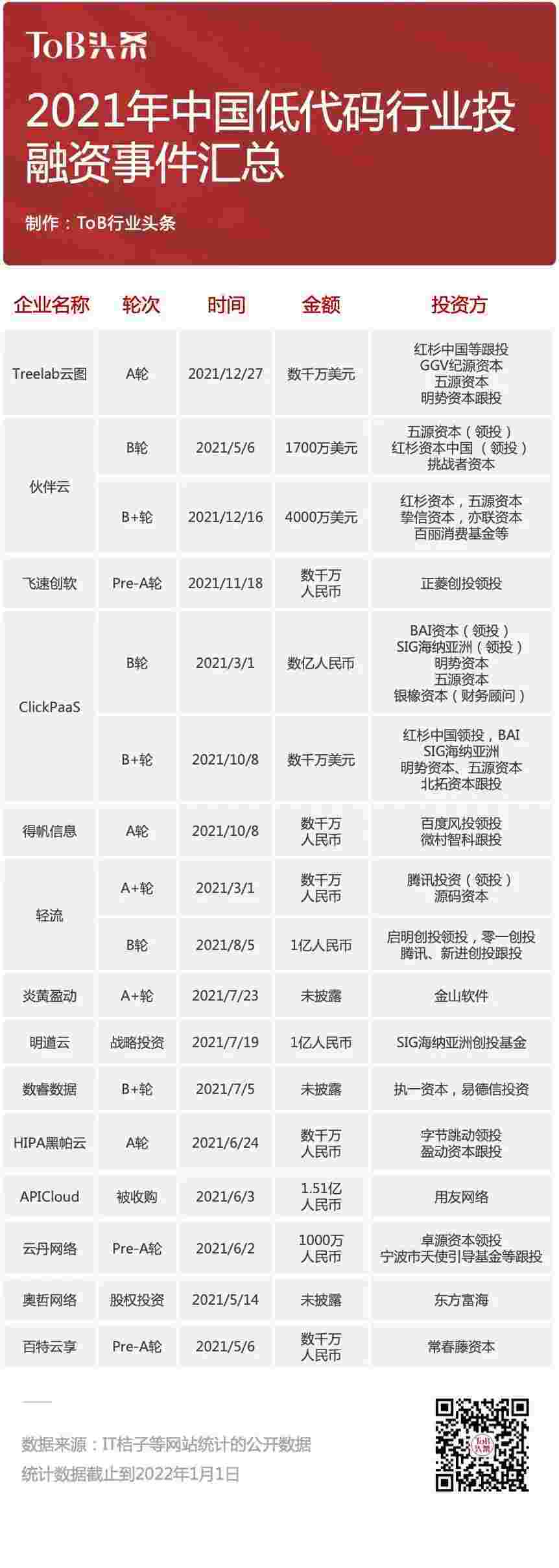到2021年,,无/低代码投融资规模势头更甚,,,其中包括轻流两轮融资(A+轮数千万人民币,,,,B轮近亿人民币)、、、美团钱包商家版 两轮融资(B轮数亿人民币,,B+轮数千万美元)、、、、百特云享数千万元Pre-A轮融资......